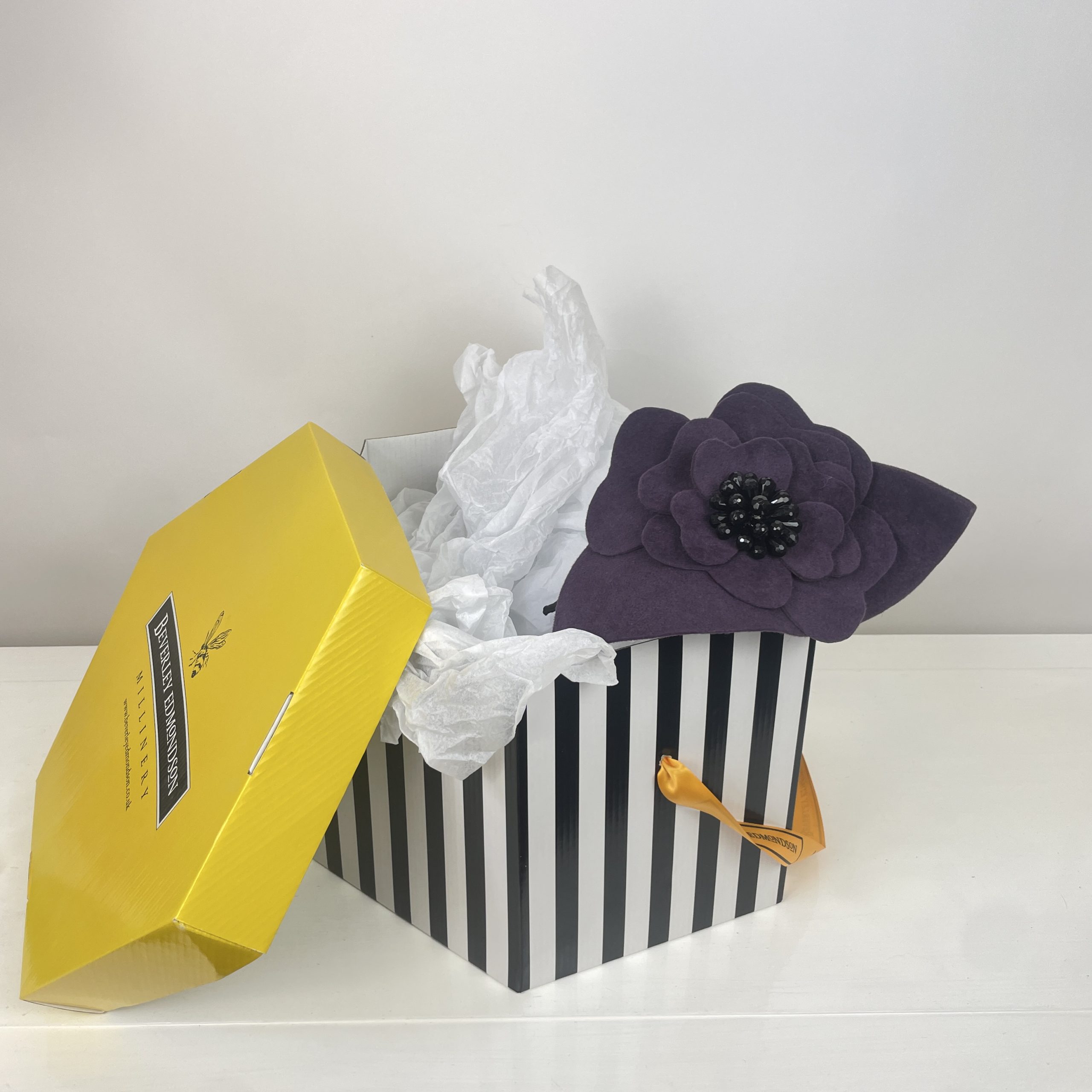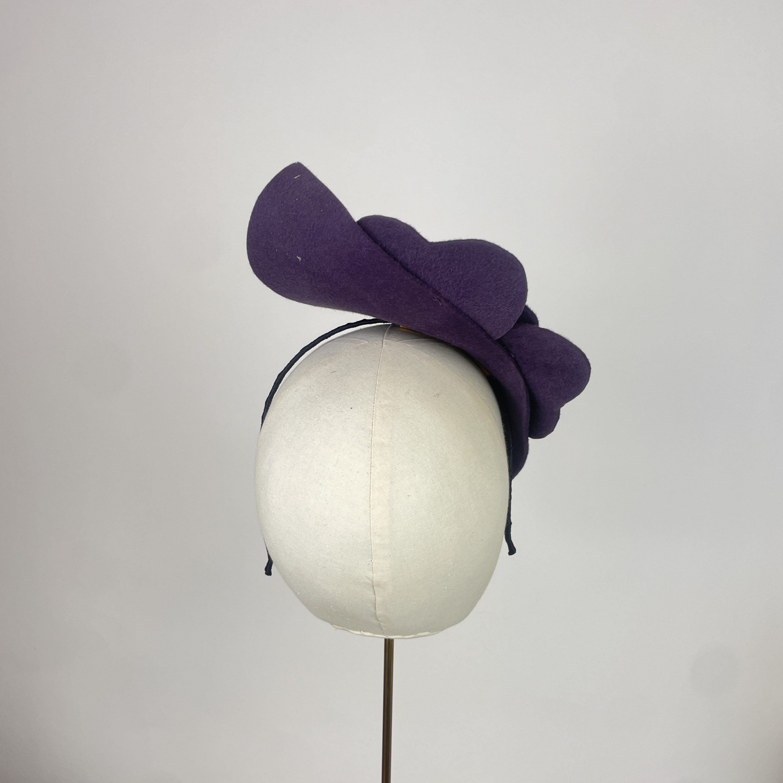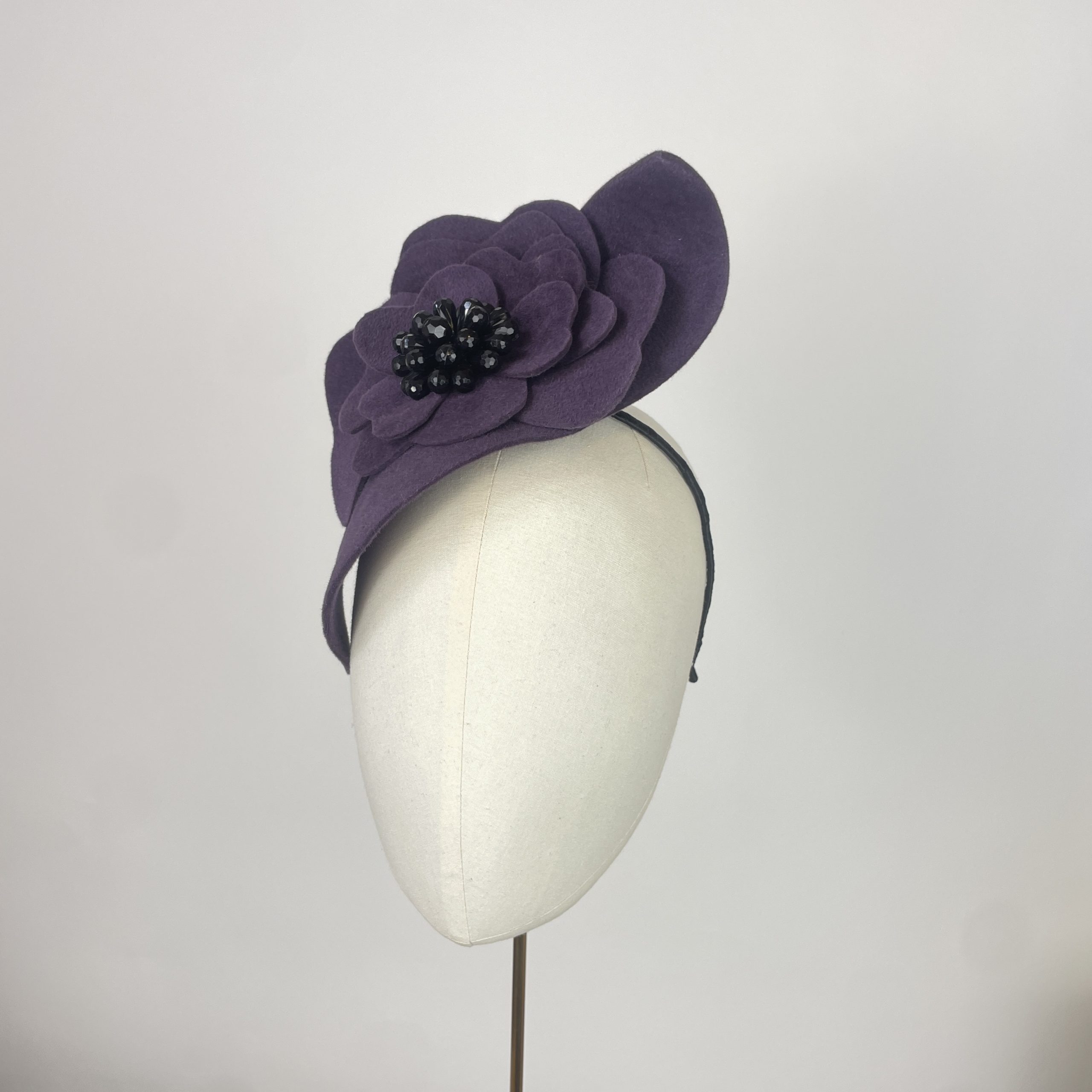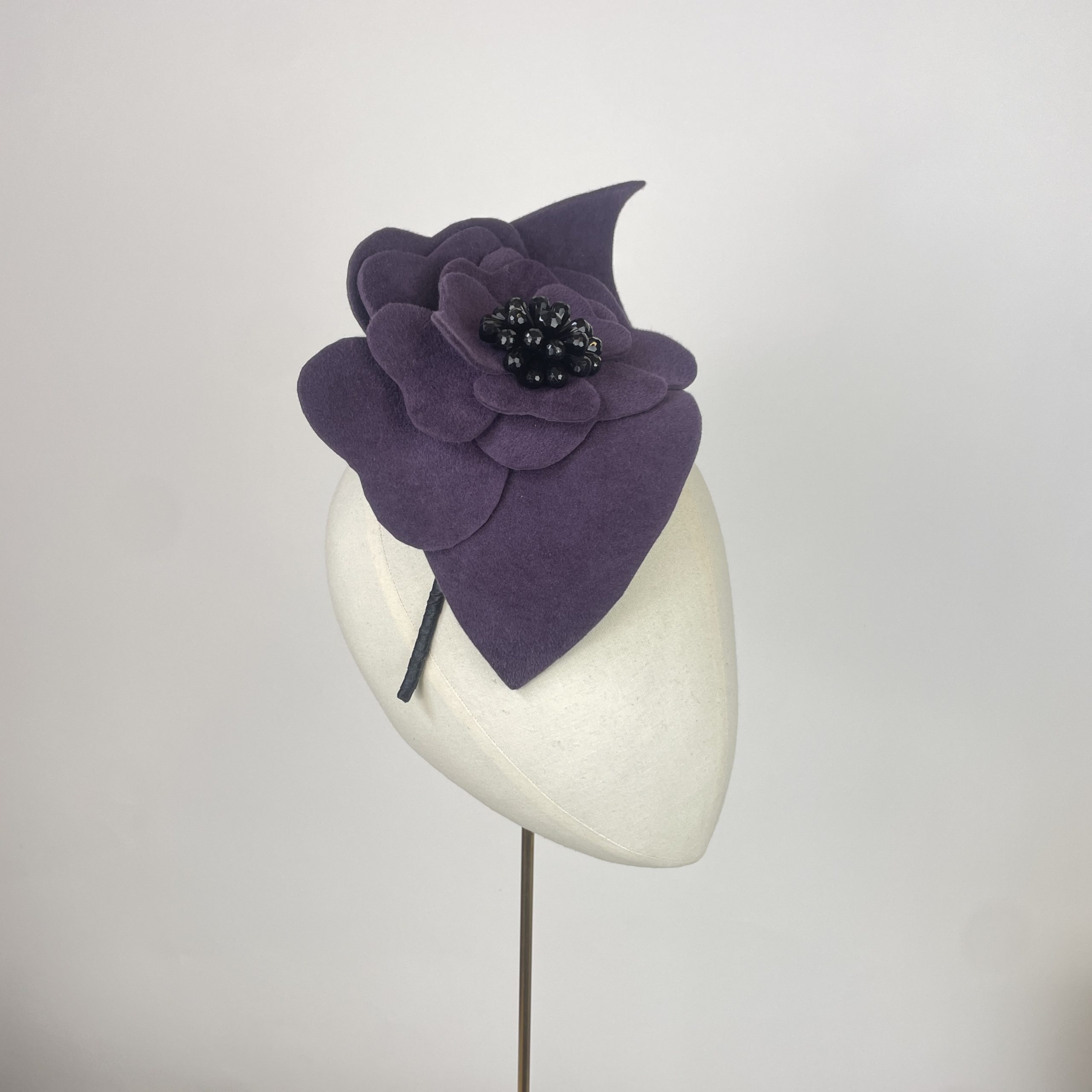 Aubergine peach skin texture felt waved saucer, hugging the face and adding height, with a felt flower with a jet beaded centre. simple, yet striking